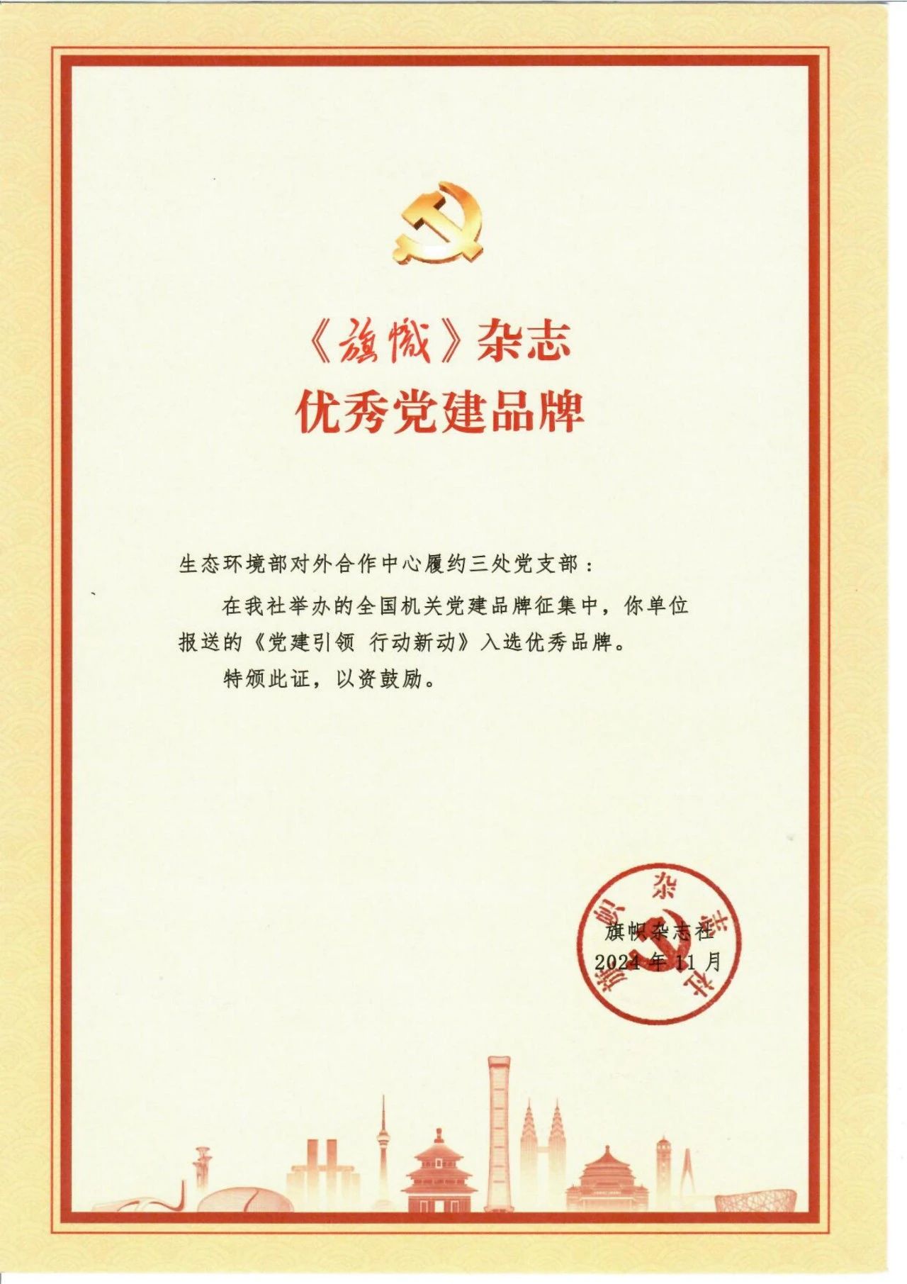 近日,中央和国家机关工委旗帜杂志社发布首届全国优秀党建品牌名单,共产生200个优秀党建品牌。生态环境部对外合作与交流中心(以下简称中心)履约三处党支部《党建引领 行动新动》荣获全国优秀党建品牌。